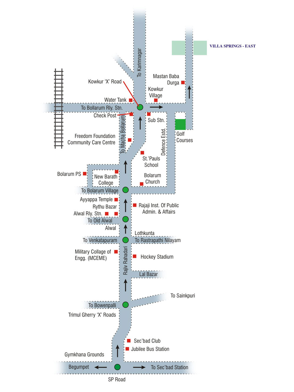 Villa Springs & Villa Springs - East are integrated township about 12 Km from Secunderabad Club. It is located near Alwal amidst the pollution-free, picturesque surrounds of Kowkoor. Spread across 16 acres, the townships combined have over 105 independent villas with the most modern infrastructural facilities like rain water harvesting units, sewerage water recycling plant, underground cabling and backup genset for common facilities. A recreation area for children's park with sprawling lawns, landscaped gardens with green belts on either side of the lanes provide the lung space and a clean environment.